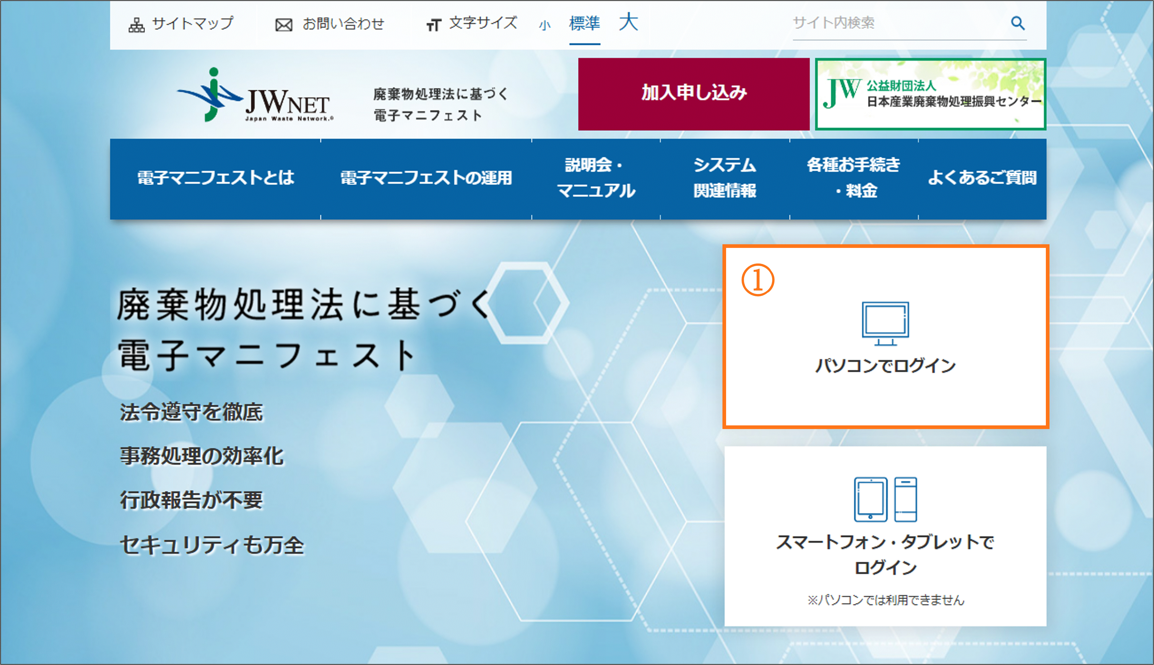 JWNETホームページのトップページにある【パソコンでログイン】をクリックします。