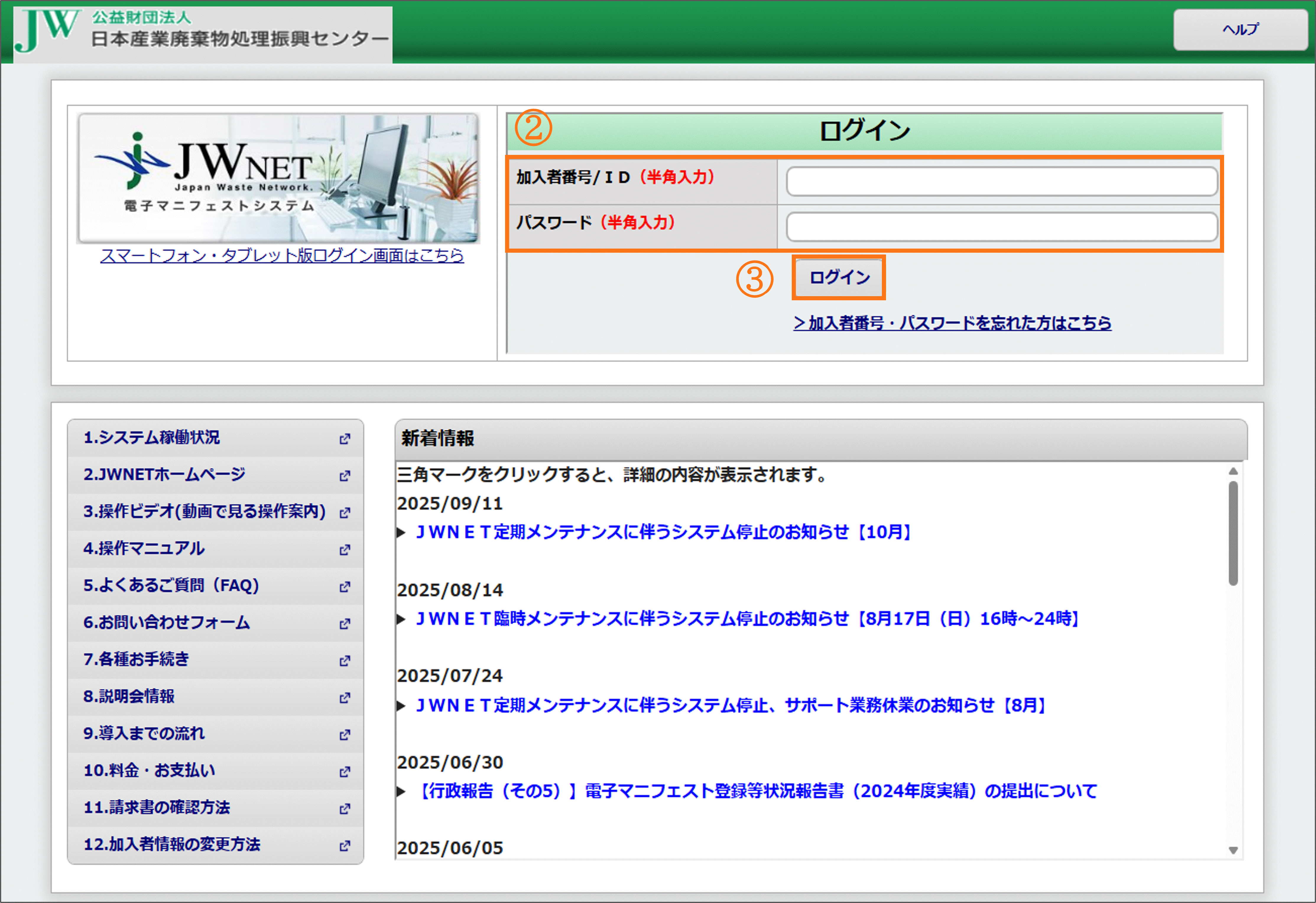 もしくは、「JWNET」と検索し、検索結果の「JWNET[Portal]」をクリックします。 - ポータル画面が表示されたら「加入者番号」と「パスワード」(はじめてJWNETにログインする場合は「仮パスワード」)を入力し、【ログイン】ボタンをクリックします。