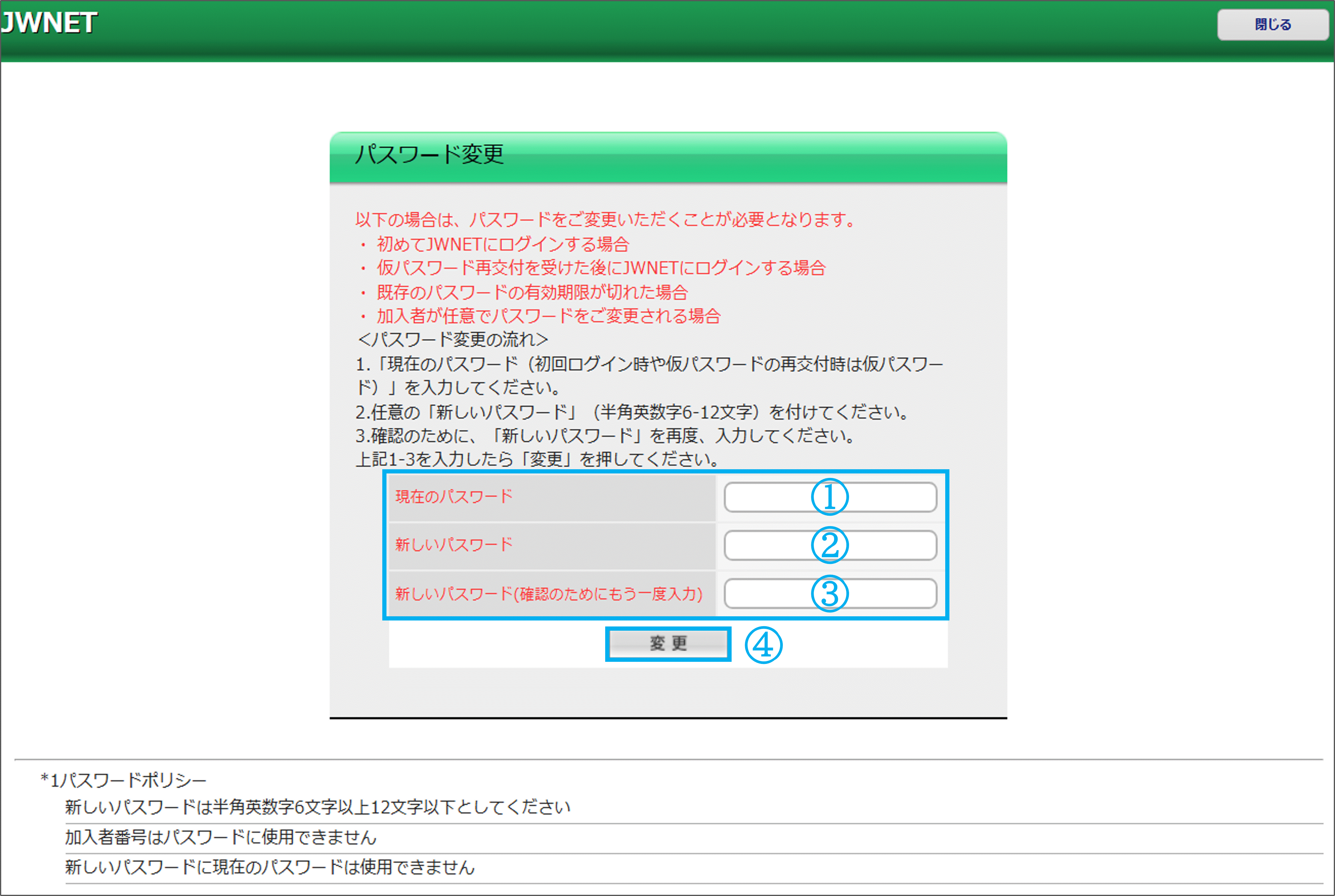 初めてJWNETにログインする場合は、仮パスワードを任意のパスワードに変更する必要があります。