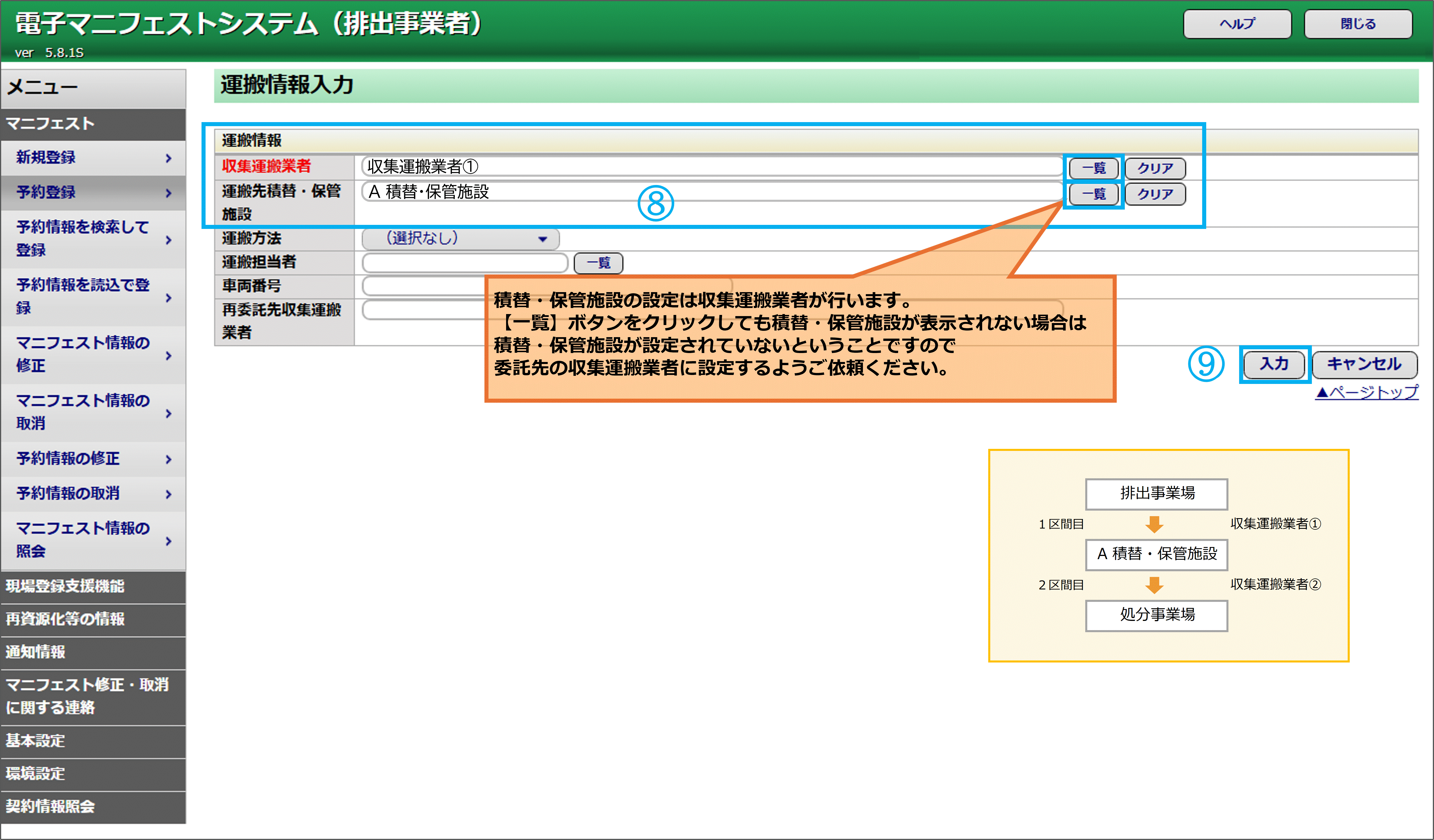 区間1に排出事業場から積替保管施設までの収集運搬を担当する業者&積替保管施設を入力し、