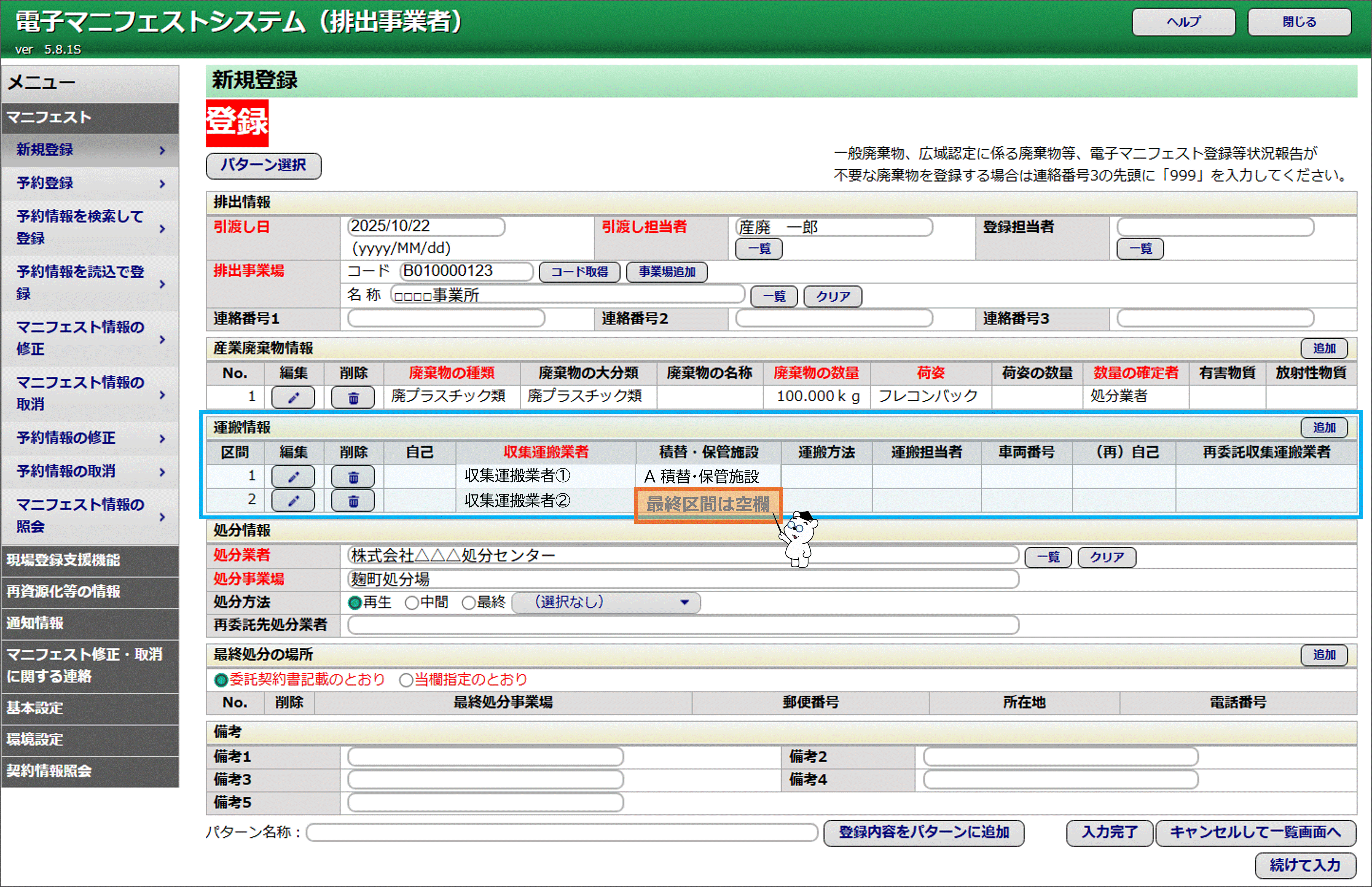 ・運搬情報の最終区間の「運搬先の事業場」=「処分業者欄に記載されている処分事業場」ですので、運搬情報の最終区間には、運搬先積替・保管施設を設定しません。 - その他の必須項目(赤字)を入力し、マニフェスト登録を完了させます。