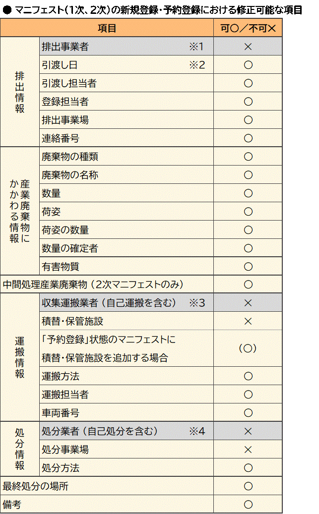 マニフェストの登録(新規登録・予約登録)後に修正可能(不可能)な項目はどれですか。