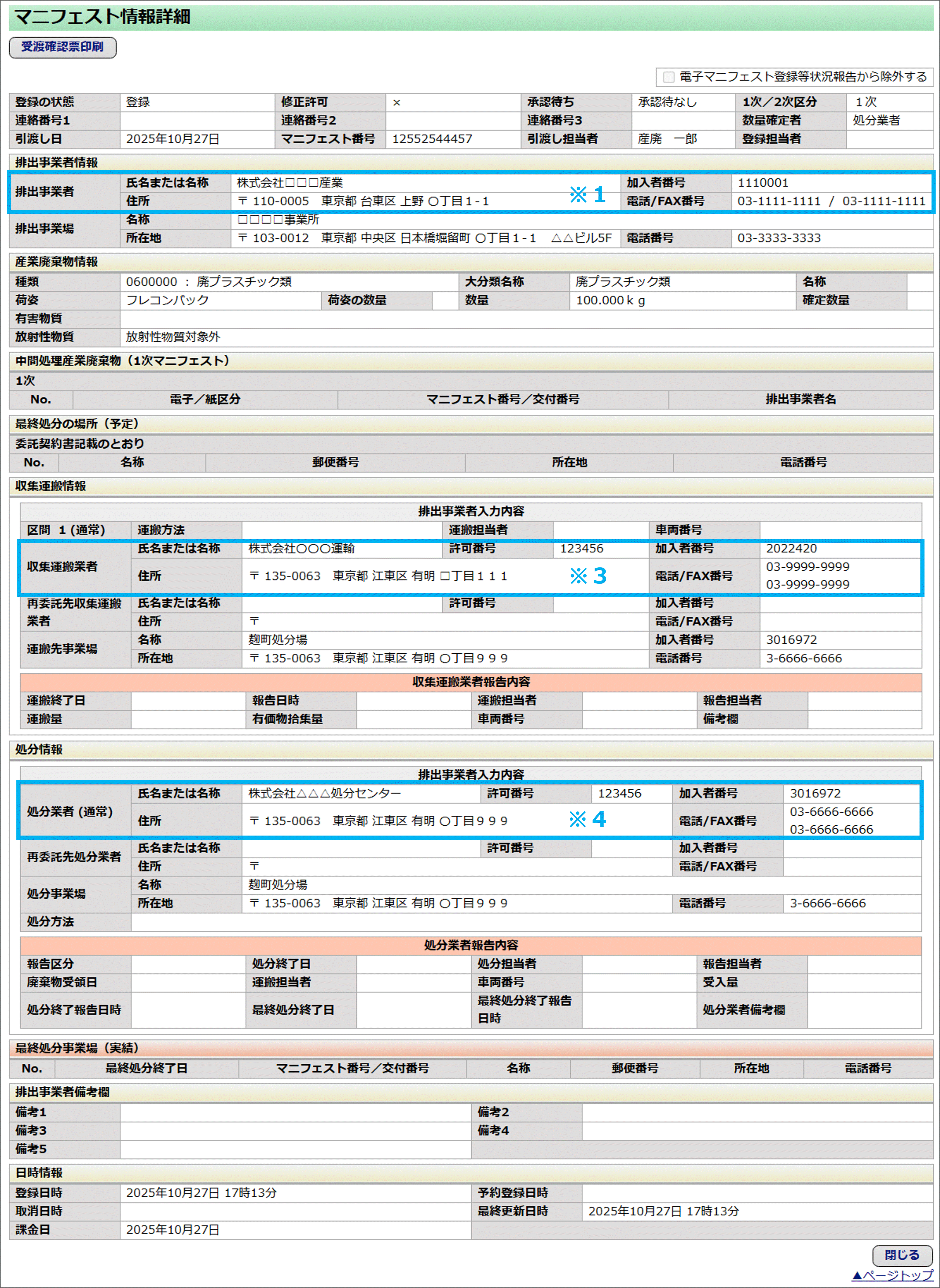 ※4 マニフェストに表示される処分業者の加入者情報(名称、住所、電話、FAX番号)、許可番号、加入者番号は変更できません。