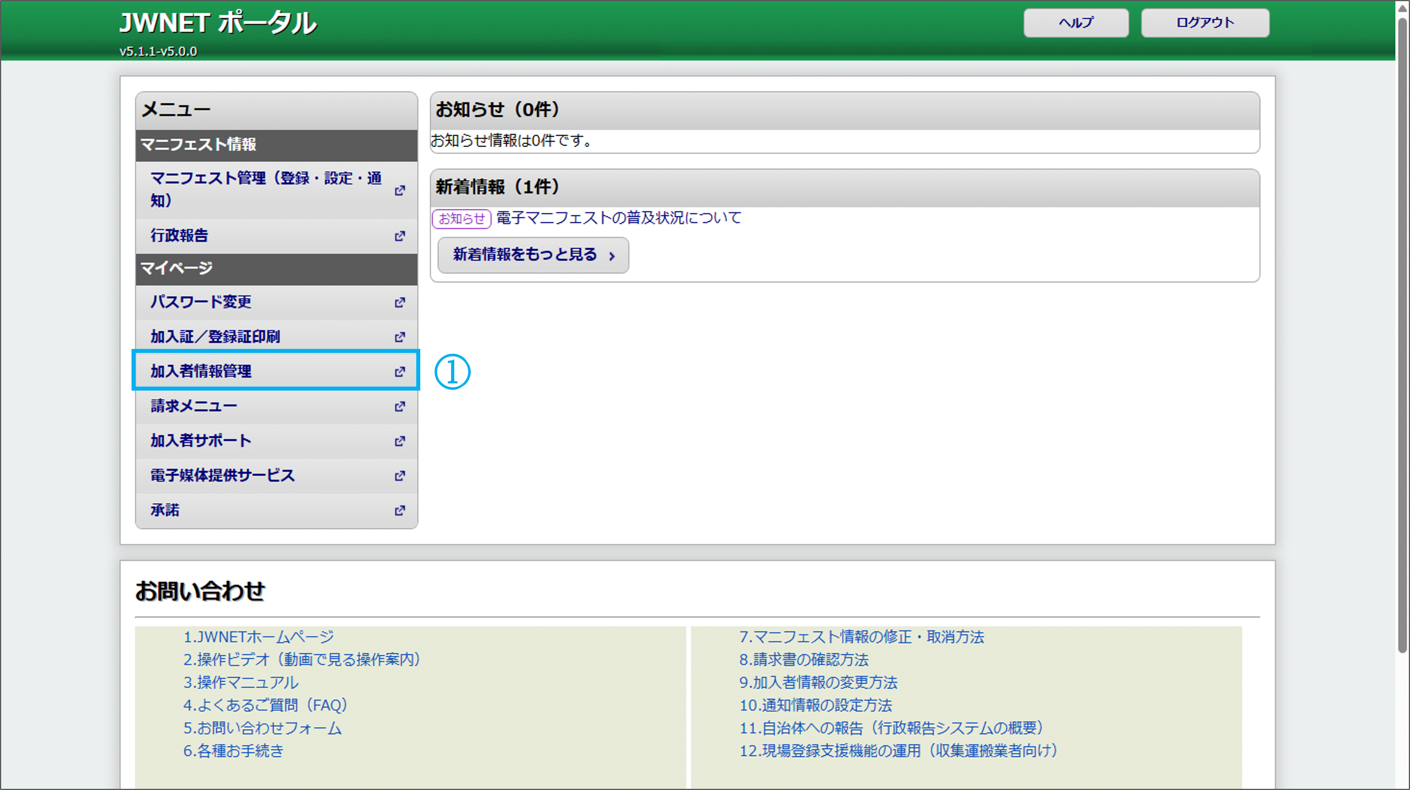 ※ サブ番号(9桁)では本機能を使用することはできません。- メニュー【マイページ】の【加入者情報管理】をクリックします。