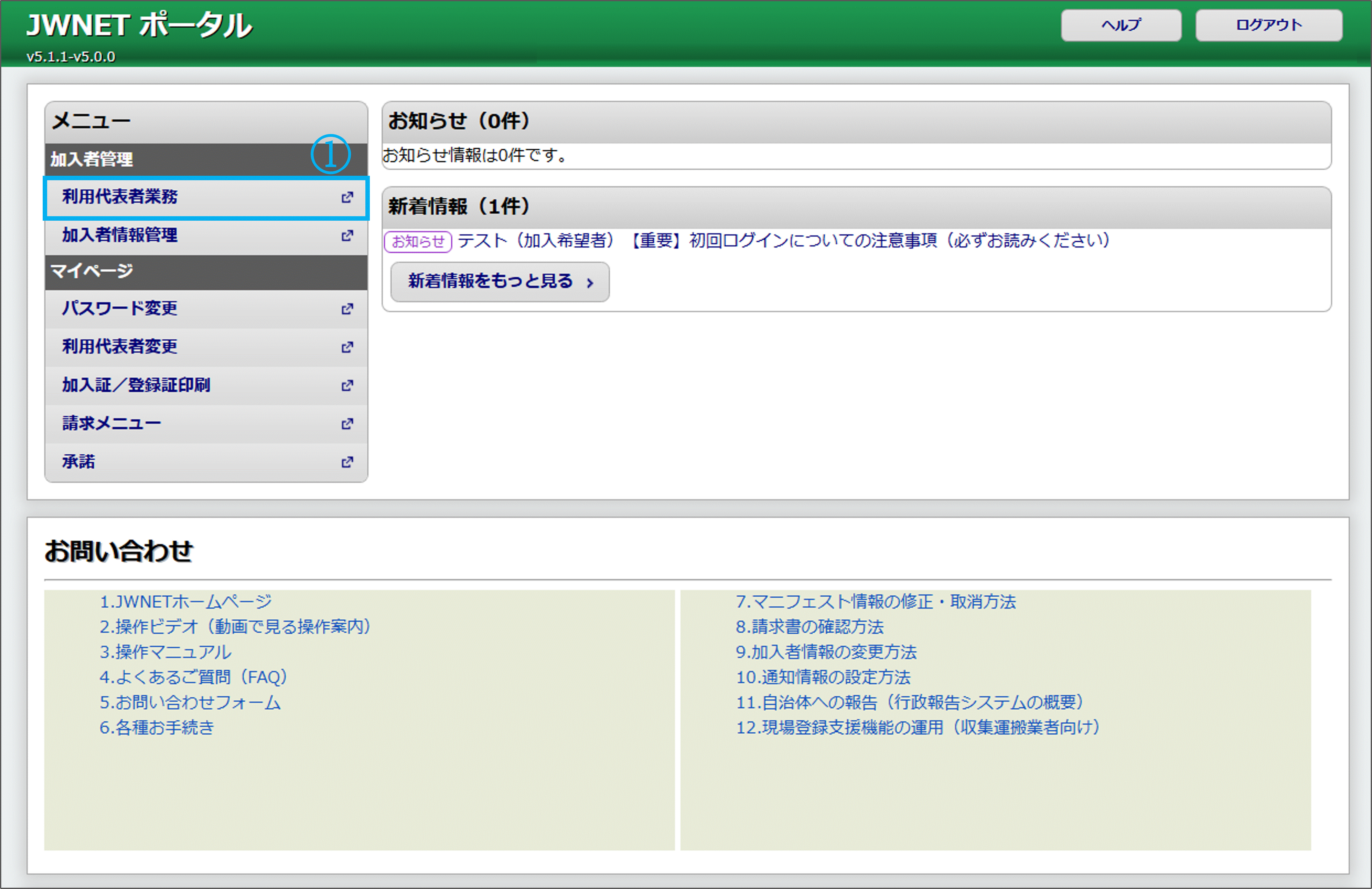 - メニュー【加入者管理】の【利用代表者業務】をクリックします。