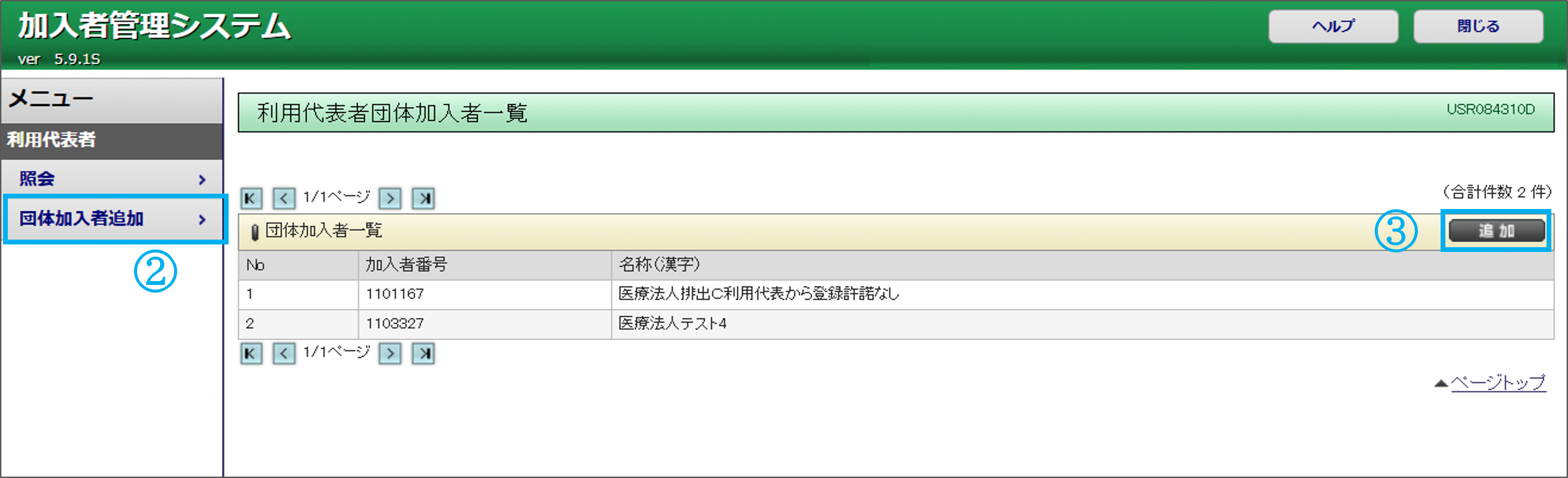 - メニュー【団体加入者追加】をクリックし、【追加】ボタンをクリックします。