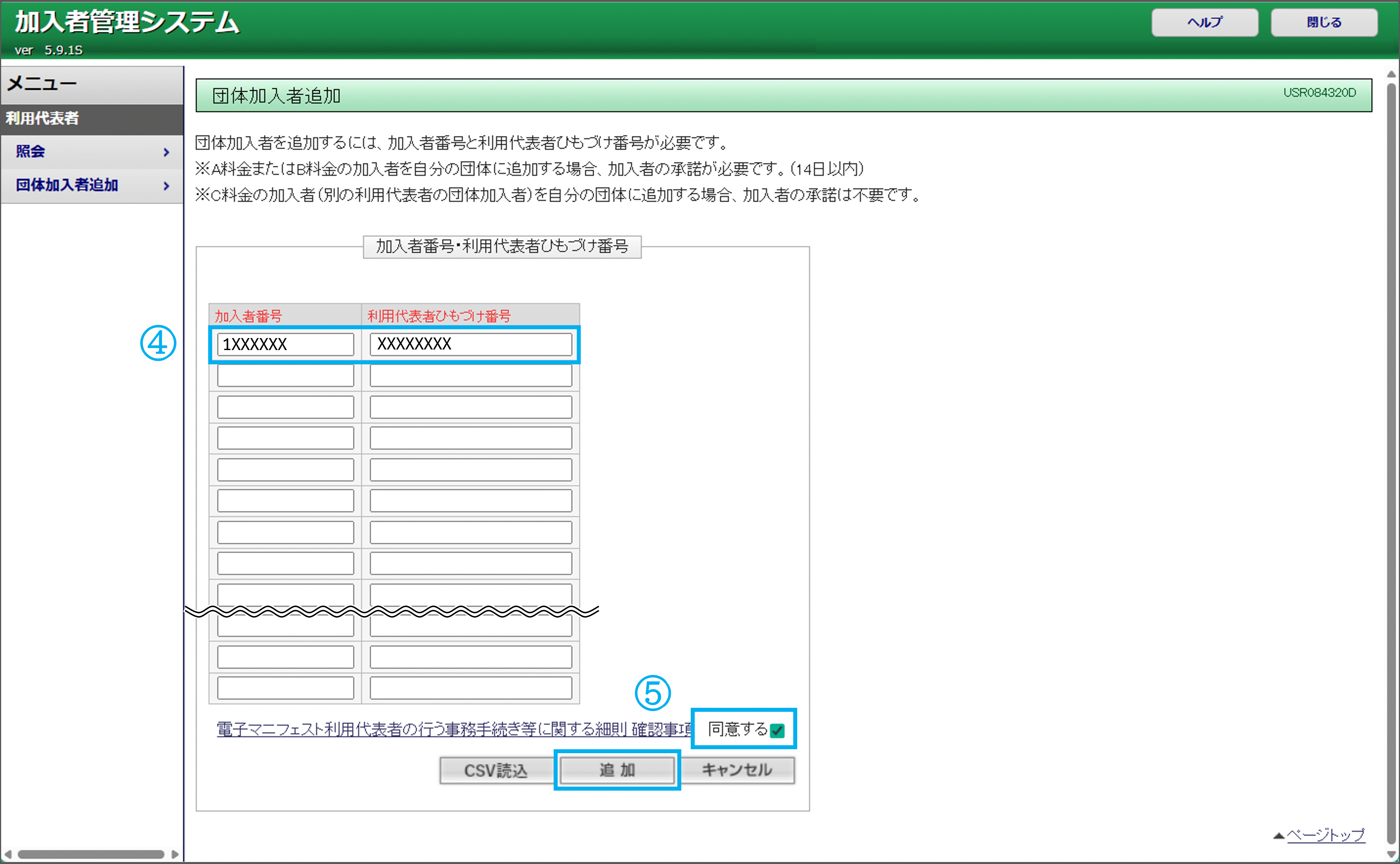 - 追加する加入者の「加入者番号」と「利用代表者ひもづけ番号」を入力し、「利用代表者の行う事務手続き等に関する細則」に同意していただいた上で【追加】ボタンをクリックします。