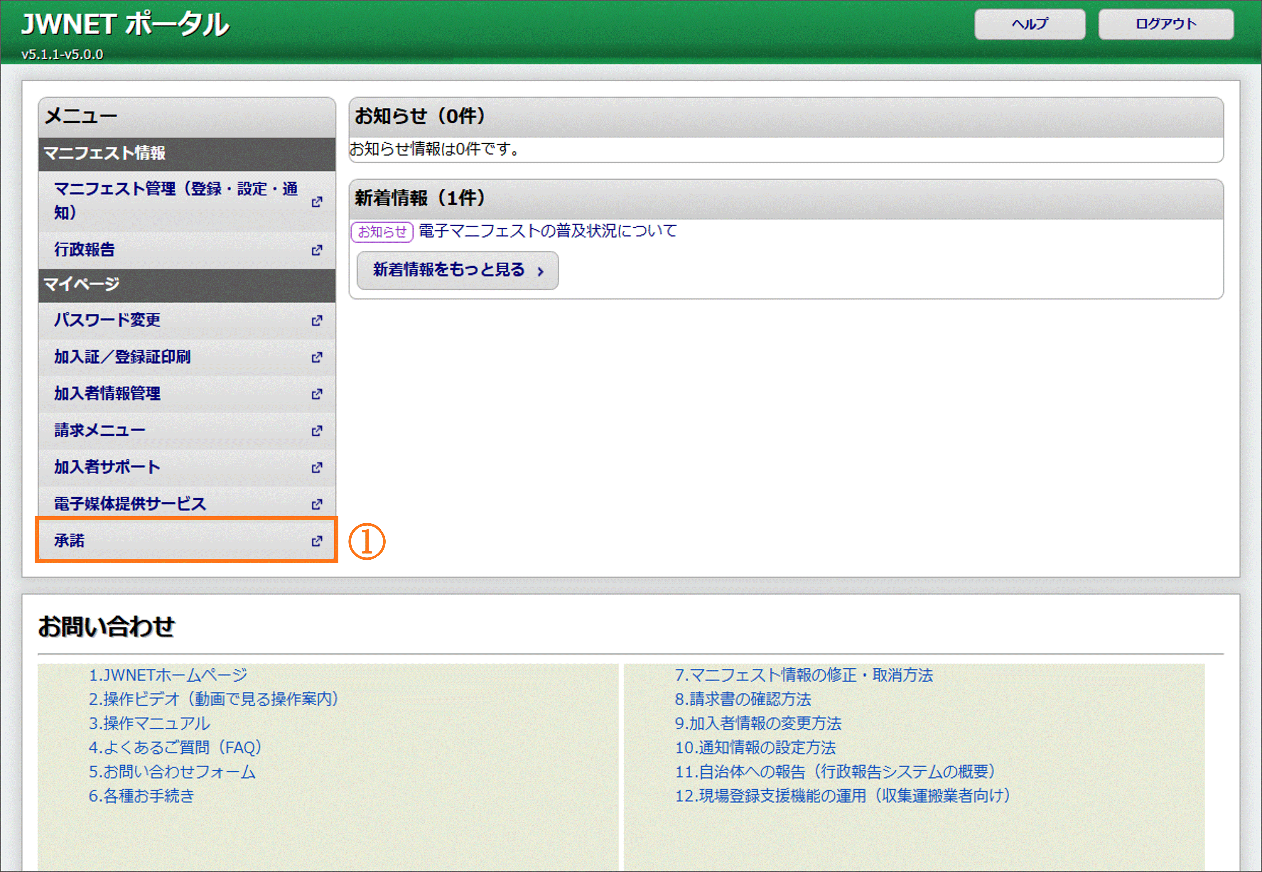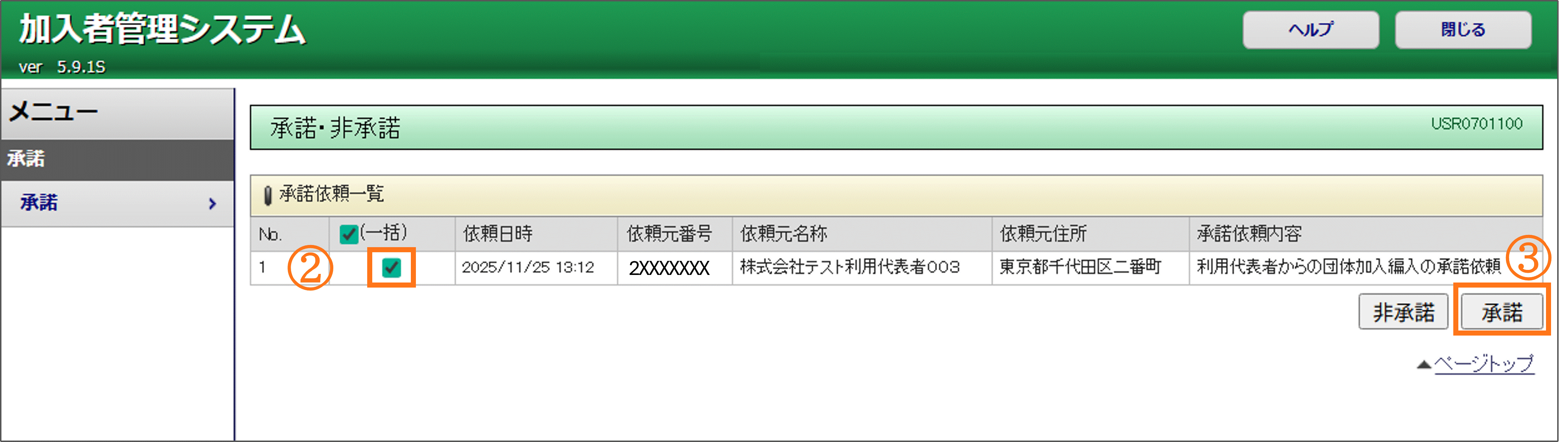 - チェックボックスにチェックを入れ、【承諾】ボタンをクリックします。「選択行を承諾にします。よろしいですか?」と表示されますので、【OK】をクリックすれば排出事業者の操作は完了です。