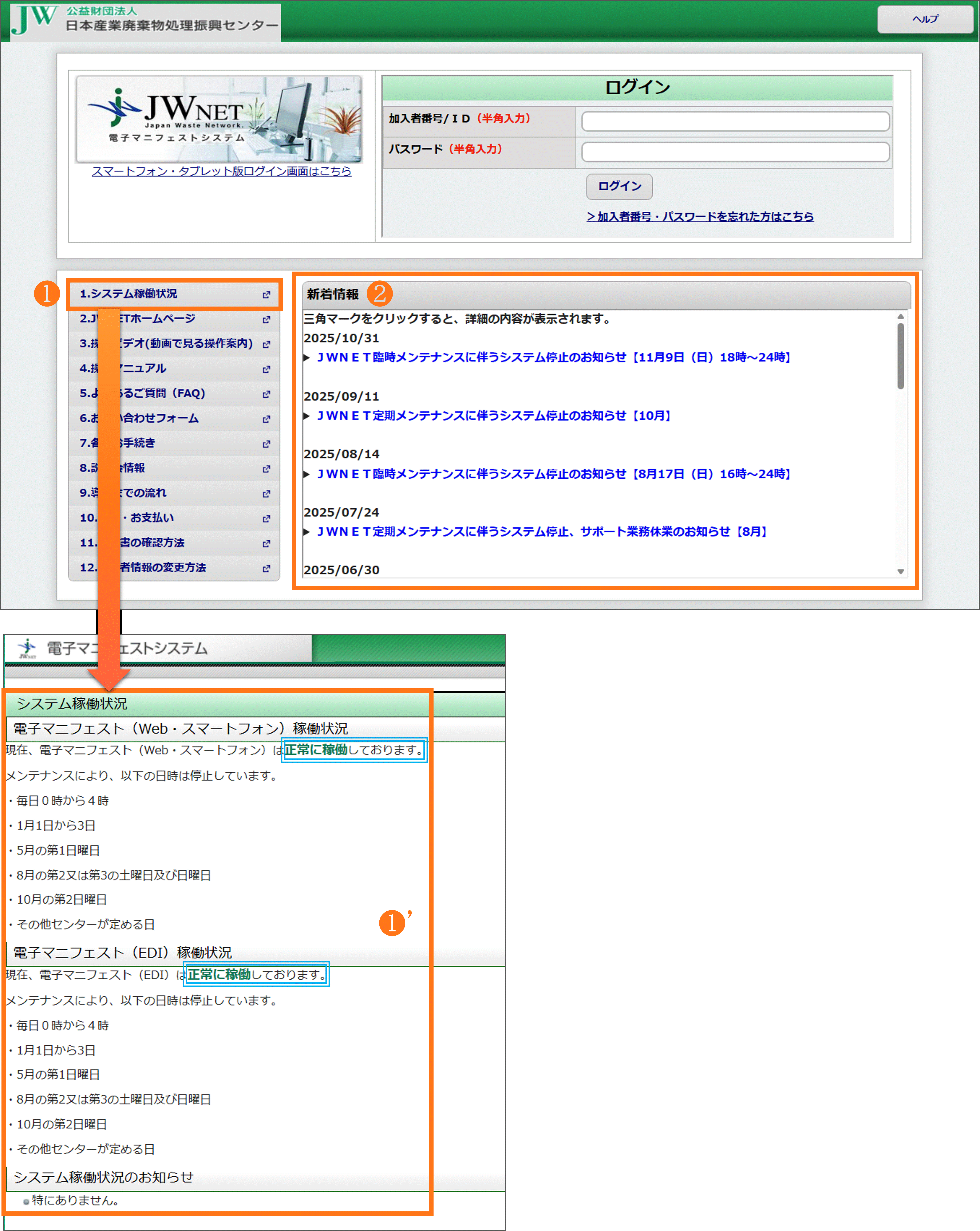 JWNETポータルのメニュー【稼働状況】」をクリック(❶)すると、JWNETの現在の稼働状況(❶')を確認できます。