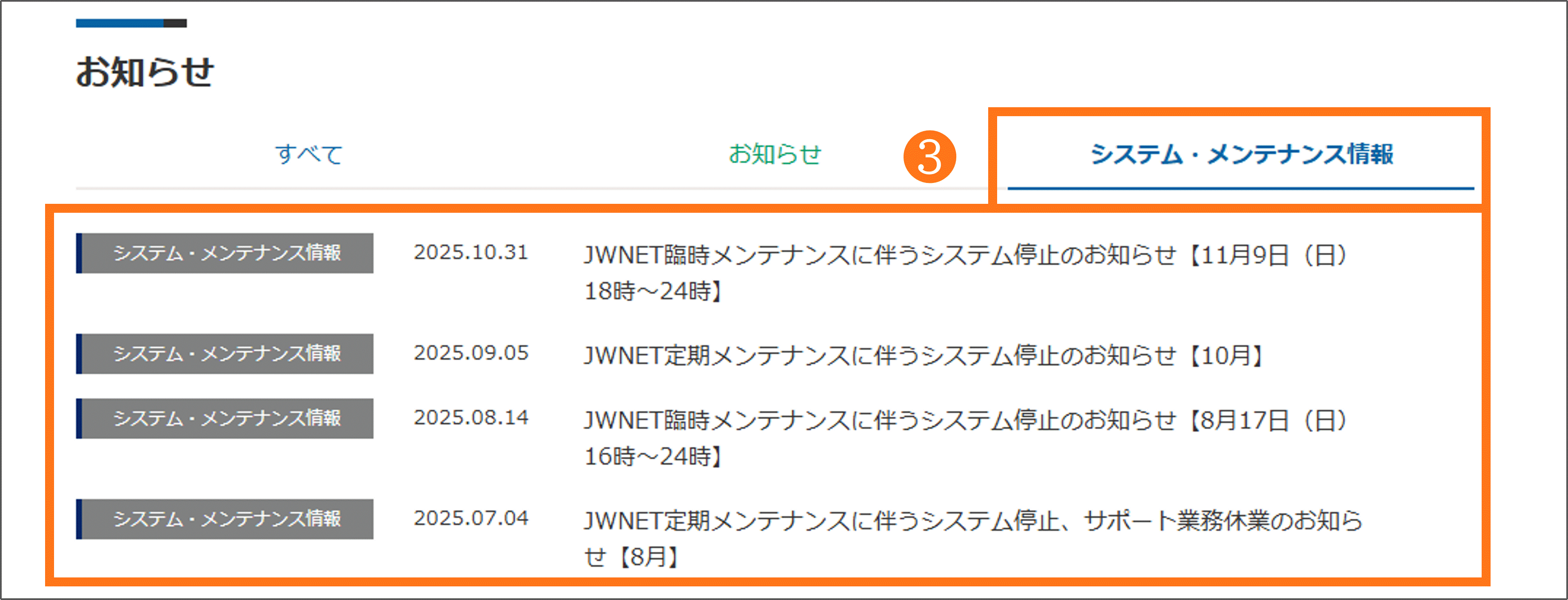 システム障害発生時には、「システム稼働状況」ページ(❶')、JWNETポータルの【新着情報】(❷)、JWNETホームページの【お知らせ】≫【システム・メンテナンス情報】(❸)にシステム障害に関する情報を掲載いたします。
